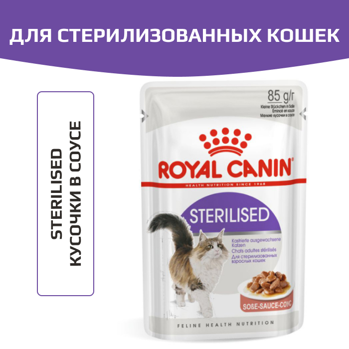 Формула влажного продукта ROYAL CANIN Sterilised (Стерилайзд), мелкие кусочки в соусе, поддерживает оптимальный вес, способствует поддержанию здоровья мочевыделительной системы, а также соответствует инстинктивным предпочтениям кошки.
