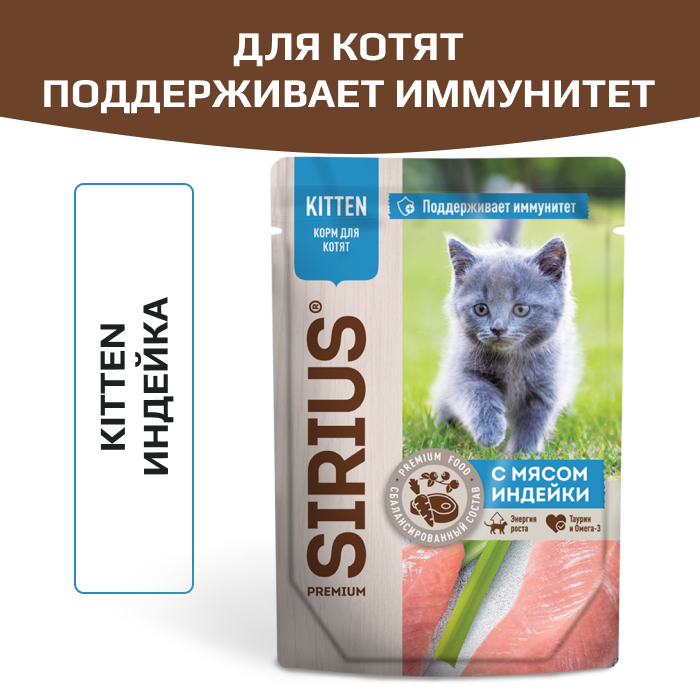 Консервированный полнорационный корм для котят с мясом индейки. Кусочки в соусе для полноценного ежедневного рациона котят с 1-2-х месяцев до 1 года.