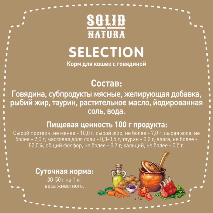 Порадуйте вашего питомца качественной и вкусной едой, которая отвечает современным требованиям к питанию животных. Solid Natura Selection — это идеальный выбор для ответственных владельцев, он не содержит сои, усилителей вкуса и красителей. Убедитесь сами, как легко и приятно кормить кошку высококачественной едой, которую она оценит по достоинству.