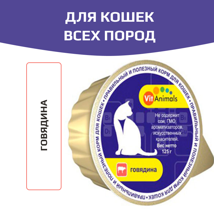 Полноценный влажный корм для взрослых кошек всех пород VitAnimals с говядиной изготовлен из натурального российского сырья. Не содержит сои, ароматизаторов, искусственных красителей, ГМО.