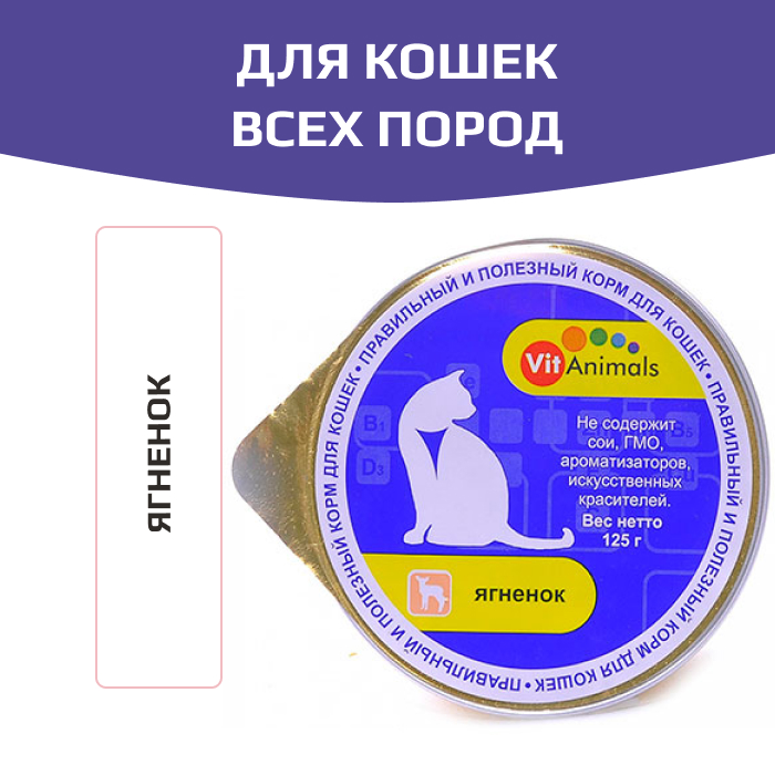 Полноценный влажный корм для взрослых кошек всех пород VitAnimals с ягненком изготовлен из натурального российского сырья. Не содержит сои, ароматизаторов, искусственных красителей, ГМО.