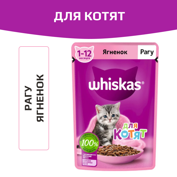 Корм Whiskas для котят Рагу с ягненком — это сбалансированный рацион для здорового роста Вашего малыша. Котенок с удовольствием попробует маленькие нежные кусочки с ягненком в ароматном соусе. Рацион Whiskas для котят создан специально, чтобы Ваш малыш получил все самое полезное и вкусное для здорового роста и развития. Котята активно растут и с первых дней нуждаются в правильном питании. Корм Whiskas для котят создан с учетом всех особенностей развития организма котенка.