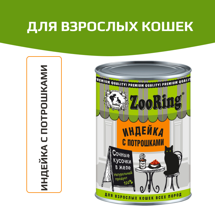 ZooRing Кусочки в желе корм консервированный для взрослых кошек индейка с потрошками.