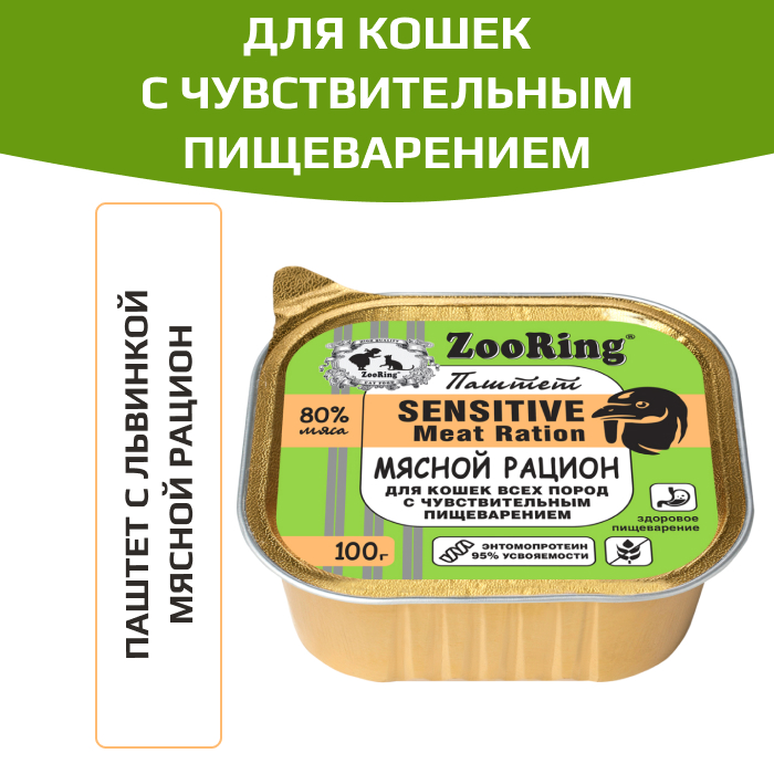 ZooRing консервы для кошек всех пород с чувствительным пищеварением паштет с львинкой мясной рацион.