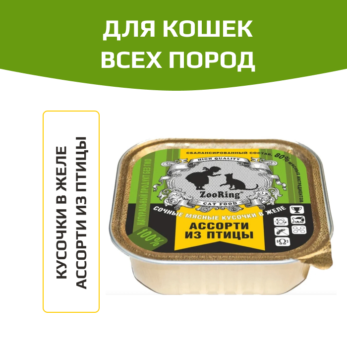 ZooRing корм консервированный для кошек кусочки в желе Ассорти из птицы.