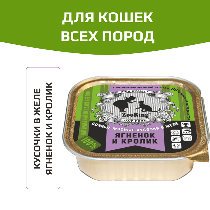 ZooRing корм консервированный для кошек кусочки в желе Ягненок и кролик.