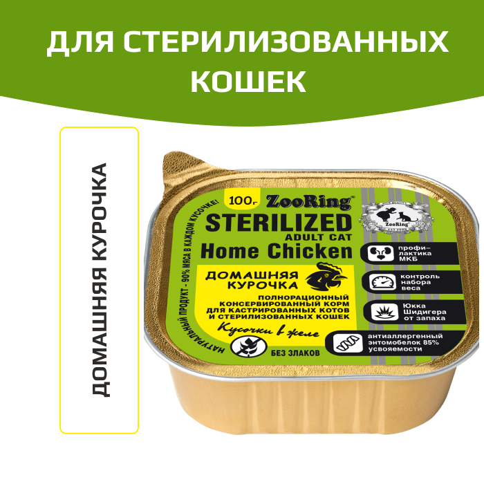 ZooRing корм консервированный для стерилизованных кошек кусочки в желе с львинкой Домашняя курочка.