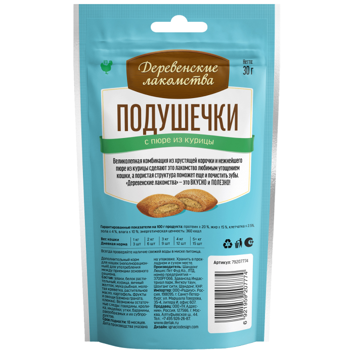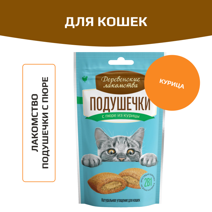 В основе "Деревенских лакомств" лежат традиции поощрения домашних питомцев, совмещенные с современными знаниями в области ветеринарии и здорового питания животных. Натуральные лакомства для кошек изготовлены с учетом сбалансированного питания из качественных, безопасных и тщательно подобранных ингредиентов, обогащены витаминами и минералами. Лучшие мясные и рыбные продукты в идеальном сочетании с полезными пищевыми добавками: витамином Е, таурином и рыбьим жиром – главный принцип, которому мы следуем в рецептах кормов и лакомств для кошек. Великолепная комбинация из хрустящей корочки и нежнейшего натурального пюре из курицы делают это лакомство любимым угощением кошки, а пористая структура помогает питомцу чистить зубы.