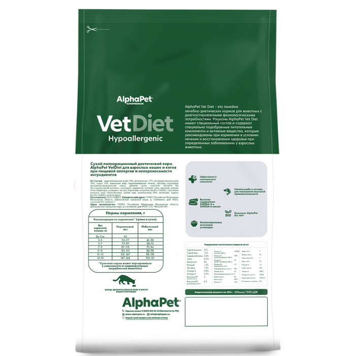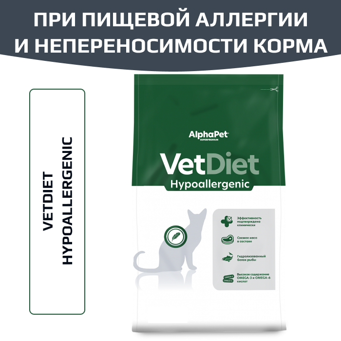 AlphaPet VetDiet Hypoallergenic сухой полнорационный диетический корм для взрослых кошек при пищевой аллергии и непереносимости ингредиентов.