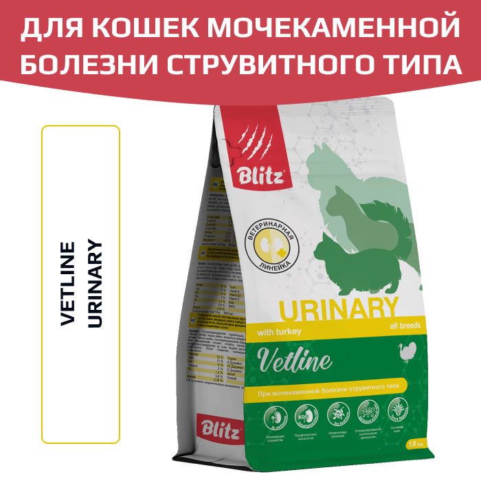 Один из наиболее востребованных кормов линейки Vetline — это диетический сухой корм для кошек Blitz Urinary Cat. Он предназначен для помощи питомцам, страдающим от образования мочевых камней струвитного типа. В составе данных уролитов преобладают соли магния, фосфора и аммония, формирующие в щелочной среде твёрдые фракции. Рацион Blitz Urinary стимулирует животных пить больше воды, а также сдвигает кислотно-щелочной баланс кошачьей мочи в сторону закисления. Это способствует растворению уже образованных солевых отложений. В свою очередь, уменьшенные дозировки магния, кальция и фосфора служат профилактикой появления новых мочевых камней.