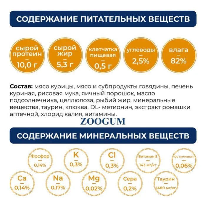 сырой протеин -10,0 г, сырой жир - 5,3 г, клетчатка - 0,5 г, углеводы - 2,5%, таурин -1480 мг/кг, влага - 80%. Энергетическая ценность 100 г продукта - 90 ккал. Витамины и минеральные вещества в 100 г продукта: кальций – 0,14%; фосфор- 0,14 %; натрий -0,17%; калий -0,3%; магний – 0,02%; хлор – 0,3%; сера – 0,2%; витамин Е – 143 мг/кг.