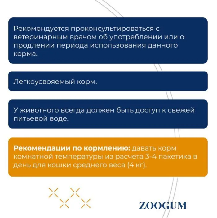 РЕКОМЕНДУЕТСЯ ПРОКОНСУЛЬТИРОВАТЬСЯ С ВЕТЕРИНАРНЫМ ВРАЧОМ ОБ УПОТРЕБЛЕНИИ ИЛИ О ПРОДЛЕНИИ ПЕРИОДА ИСПОЛЬЗОВАНИЯ ДАННОГО КОРМА. У ЖИВОТНОГО ВСЕГДА ДОЛЖЕН БЫТЬ ДОСТУП К СВЕЖЕЙ ПИТЬЕВОЙ ВОДЕ.