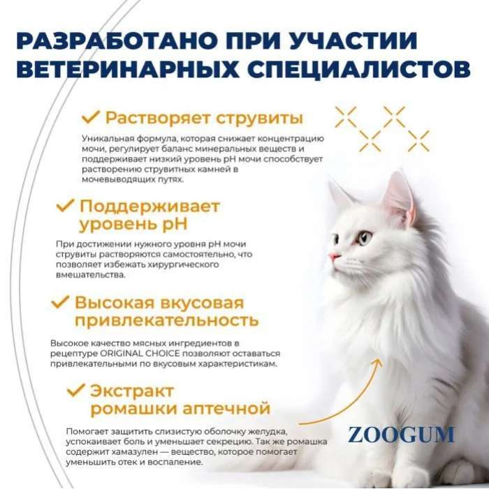 Original Choice Vetdiet Urinary - поддерживает уровень pH. При достижении нужного уровня pH мочи струвиты растворяются самостоятельно, что позволяет избежать хирургического вмешательства.