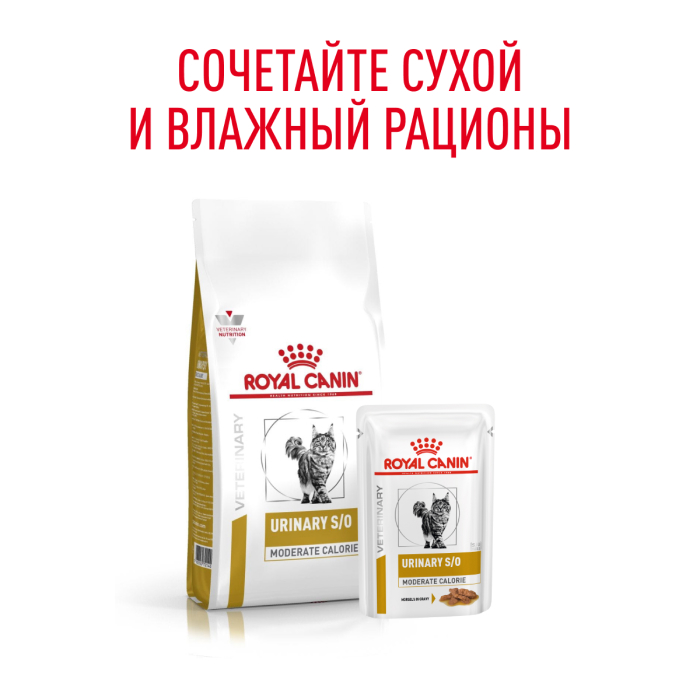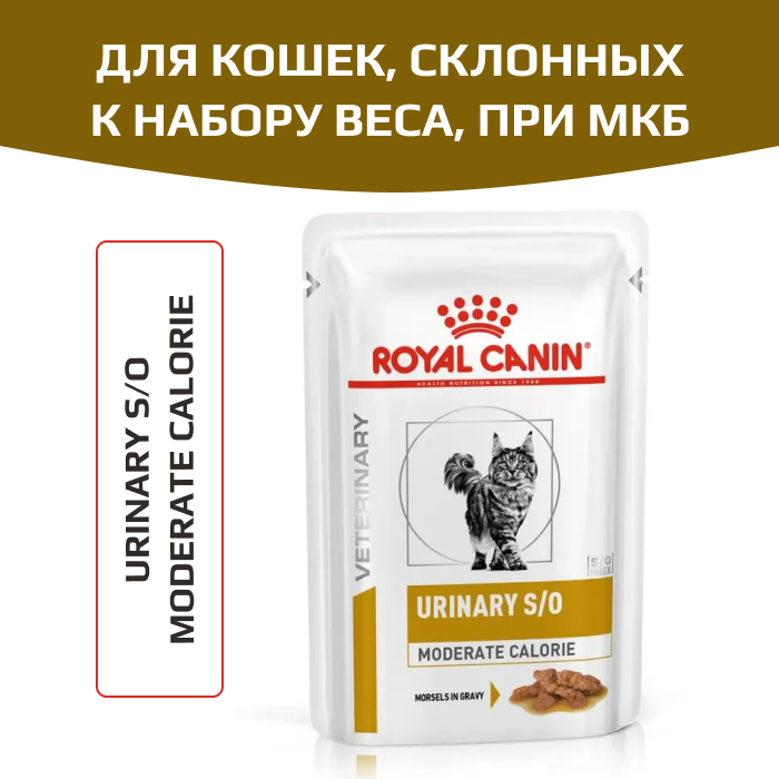 Влажный корм ROYAL CANIN® URINARY S/O MODERATE CALORIE (УРИНАРИ С/О МОДЕРЕЙТ КЭЛОРИ), мелкие кусочки в соусе - полнорационный диетический корм для взрослых кошек, склонных к набору лишнего веса, способствующий растворению струвитных камней и предотвращению их повторного образования за счет подкисления мочи и низкого содержания магния. Формула помогает поддерживать оптимальный вес кошки за счет умеренной калорийности.