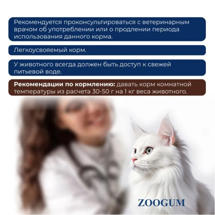 РЕКОМЕНДУЕТСЯ ПРОКОНСУЛЬТИРОВАТЬСЯ С ВЕТЕРИНАРНЫМ ВРАЧОМ ОБ УПОТРЕБЛЕНИИ ИЛИ О ПРОДЛЕНИИ ПЕРИОДА ИСПОЛЬЗОВАНИЯ ДАННОГО КОРМА. У ЖИВОТНОГО ВСЕГДА ДОЛЖЕН БЫТЬ ДОСТУП К СВЕЖЕЙ ПИТЬЕВОЙ ВОДЕ.
