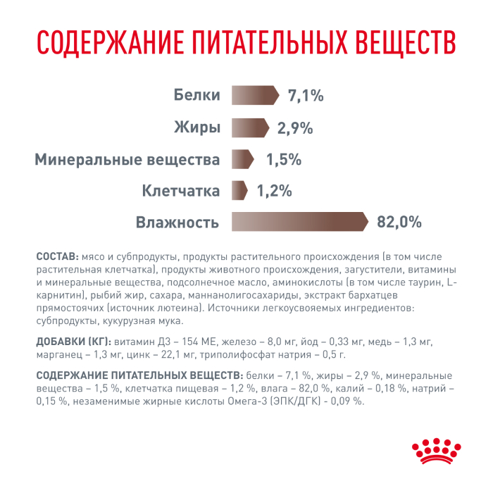мясо и субпродукты, продукты растительного происхождения (в том числе растительная клетчатка), продукты животного происхождения, загустители, витамины и минеральные вещества, подсолнечное масло, аминокислоты (в том числе таурин, L-карнитин), рыбий жир, сахара, маннанолигосахариды, экстракт бархатцев прямостоячих (источник лютеина). Источники легкоусвояемых ингредиентов: субпродукты, кукурузная мука.