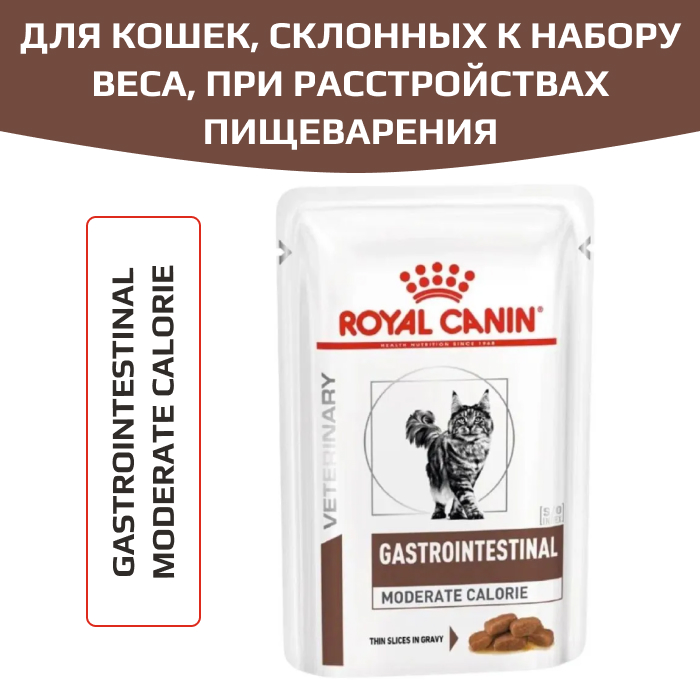 Royal Canin Gastrointestinal Moderate Calorie корм влажный для кошек, склонных к набору веса, при расстройствах пищеварения.