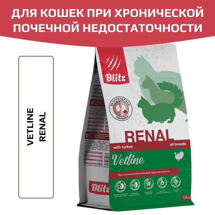 Blitz Vetline Renal Cat сухой полнорационный диетический корм для кошек при хронической почечной недостаточности.
