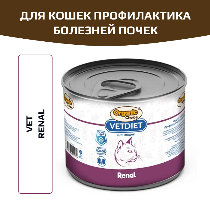 Диетический корм Organic Сhoice VET Renal (Ренал) для кошек предназначен для профилактического питания животных при почечной недостаточности. Пониженненный уровень фосфора способствует замедлению развития болезни, Омега-3 и Омега-6 жирные кислоты имеют противовоспалительное действие и поддерживают почечную перфузию, содержит комплекс витаминов и макроэлементов.