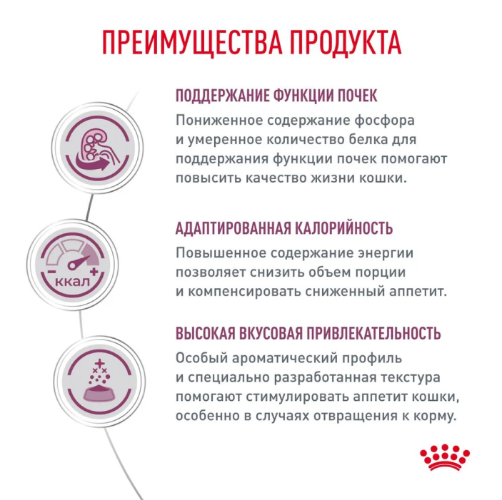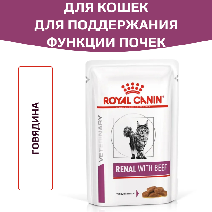 Влажный корм ROYAL CANIN RENAL WITH BEEF (РЕНАЛ С ГОВЯДИНОЙ), мелкие кусочки в соусе - полнорационный диетический корм для взрослых кошек для поддержания функции почек при хронической болезни почек. Пониженное содержание фосфора и умеренное количество белка помогают поддерживать функции почек. Специально разработанный ароматический профиль помогает удовлетворить особые вкусовые предпочтения кошки.