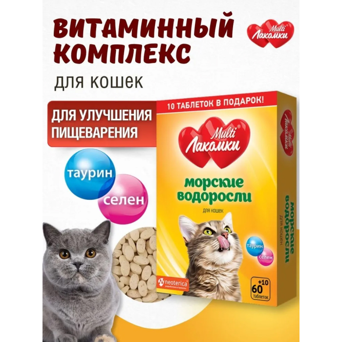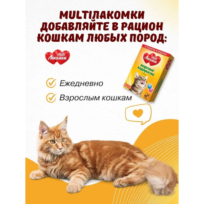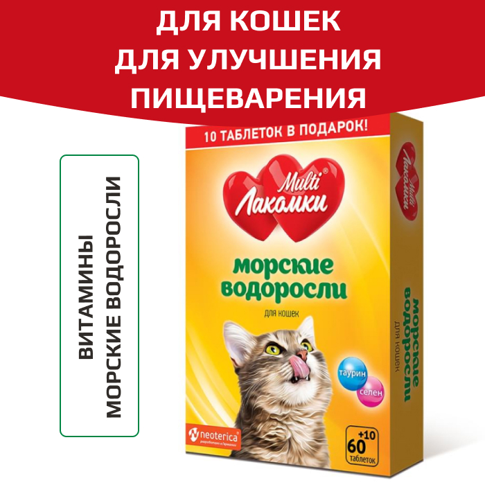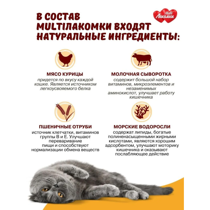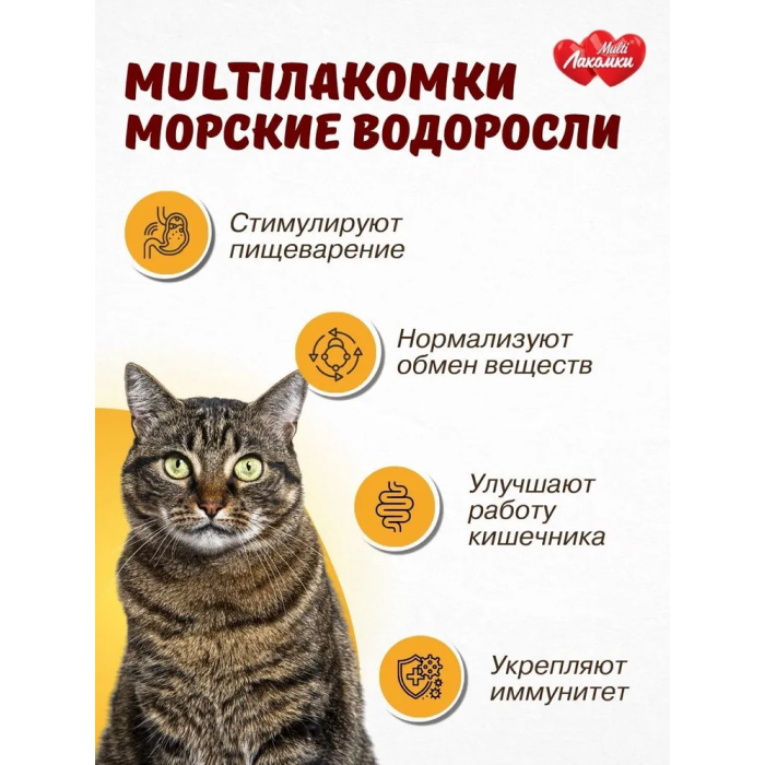 MultiЛакомки Морские водоросли - для улучшения пищеварения и поддержания иммунитета. MultiЛакомки - это прекрасное дополнение к ежедневному рациону кошки. Побалуйте любимого питомца МультиЛакомками или поощрите за хорошее поведение. Удивительно вкусные лакомства не оставят питомца равнодушным!