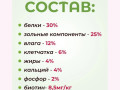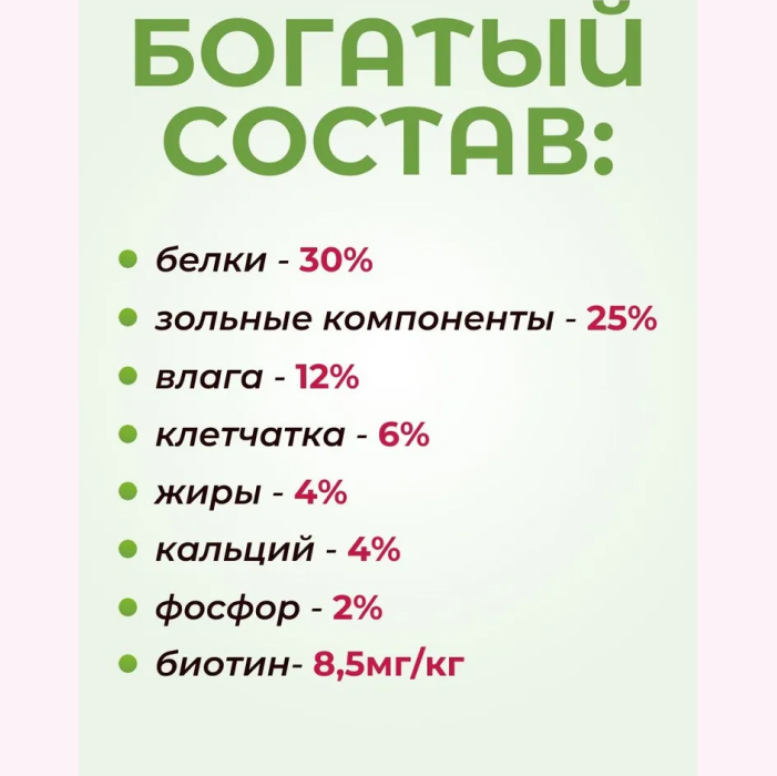 Протеин - 30%, жиры - 4%, клетчатка - 6%, зольные компоненты - 25%, влага - 12%, кальций - 4%, фосфор - 2%, пищевые дрожжи, костная мука, сухое молоко, вкусовые добавки, витамины, аминокислоты и минеральные вещества, А, Д, Е, С, В1 (тиамин), В2 (рибофлавин), В3 (ниацин), В4 (холин), В5 (пантотеновая кислота), В6 (пиридоксин), ВС (фолиевая кислота), В12 (цианокобаламин), витамин К,кальций, фосфор, калий, натрий, магний, железо, медь, марганец, цинк, селен,лизин, аргенин, гистидин, фениламин, триптофан, метионин, цистин.
