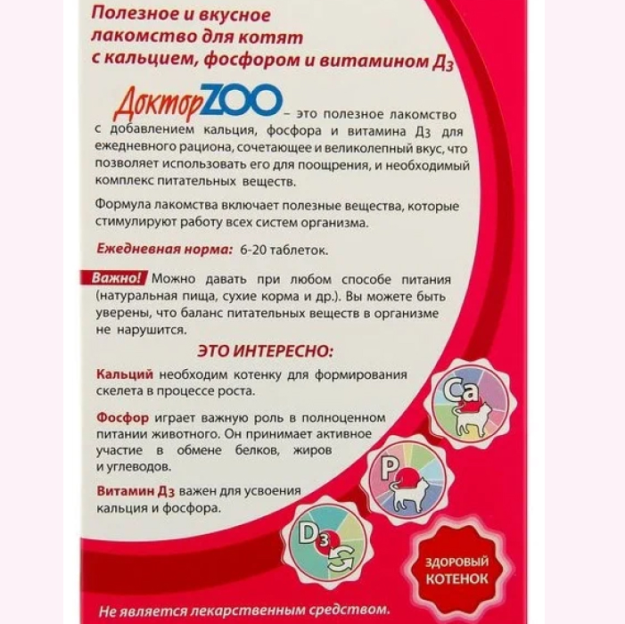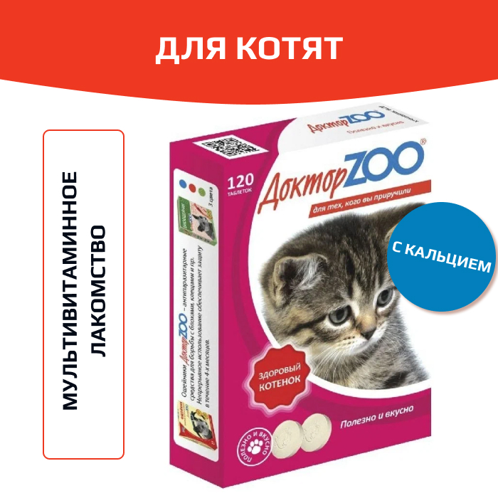Доктор ZOO - это необходимая добавка к ежедневному питанию котят с трехмесячного возраста, которая сочетает и великолепный вкус, и необходимый для здоровья комплекс витаминов. Важная особенность этого мультивитаминного лакомства - его можно давать котятам при любом способе питании (натуральная пища, сухие корма и др.).