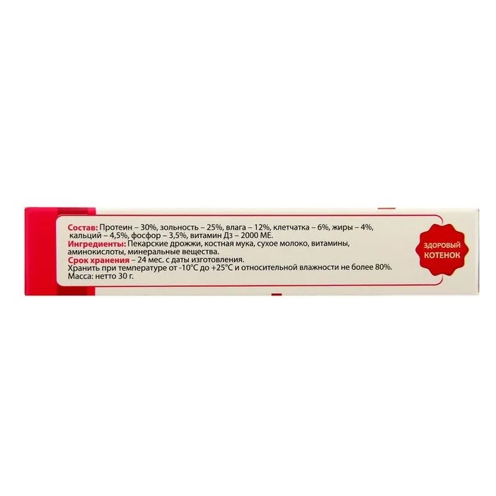 Формула лакомства включает комплекс витаминов и минеральных веществ, которые стимулируют работу всех систем организма. В том числе кальций, фосфор и большое количество витамина Д, которые очень нужны растущему организму котят.