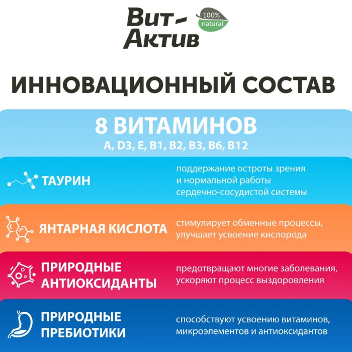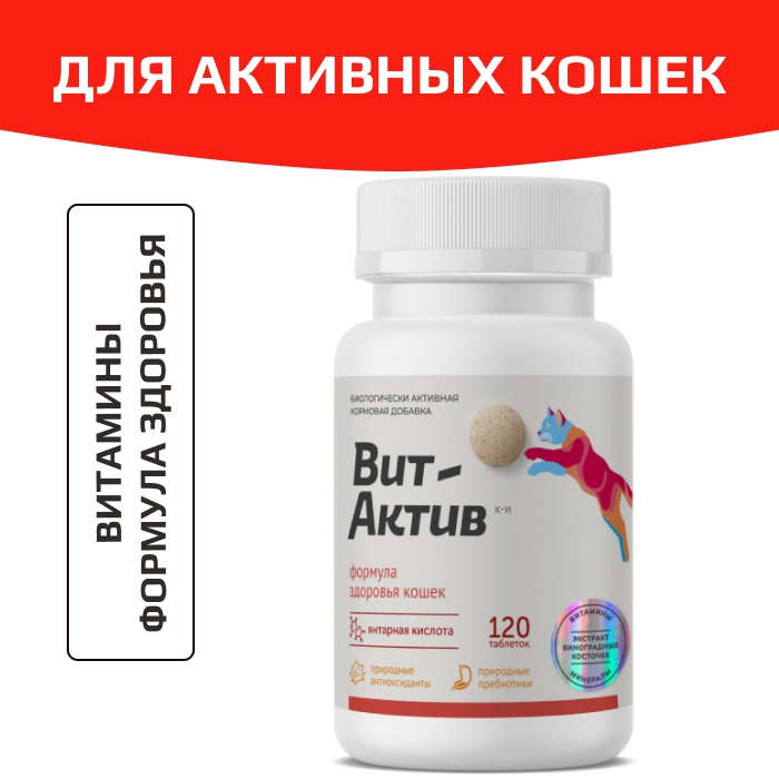 Вит-Актив - витаминно-минеральный комплекс для обеспечения физиологических потребностей кошек в витаминах, аминокислотах и минеральных веществах, обогащения рациона природными антиоксидантами и пребиотиками. Способствует активному и здоровому образу жизни кошек. Природные антиоксиданты предотвращают многие заболевания, ускоряют процесс выздоровления. Природные пребиотики способствуют усвоению витаминов, микроэлементов и антиоксидантов.