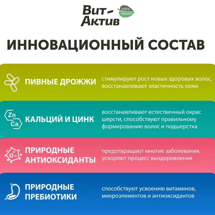 Вит-Актив – витаминно-минеральный комплекс для улучшения состояния кожно-шерстного покрова, обеспечения физиологических потребностей кошек в витаминах, аминокислотах и минеральных веществах, обогащения рациона природными антиоксидантами и пребиотиками.