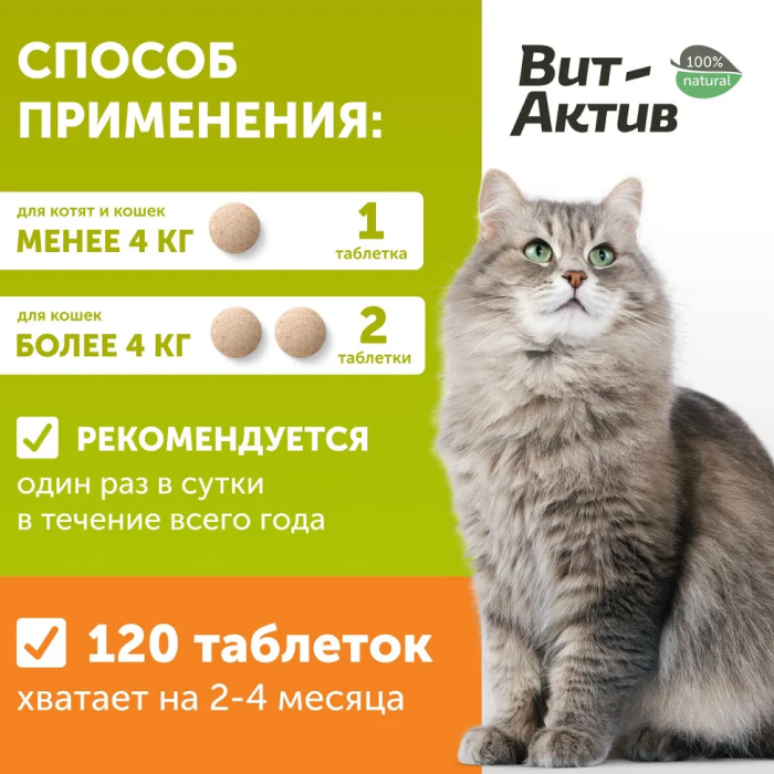 Рекомендуется один раз в сутки в течение всего года - для котят и кошек менее 4 кг - 1 таблетка - для кошек более 4 кг – 2 таблетки Вит-Актив совместим со всеми ингредиентами кормов и лекарственными препаратами. Фасовка 120 таблеток по 0,5 г