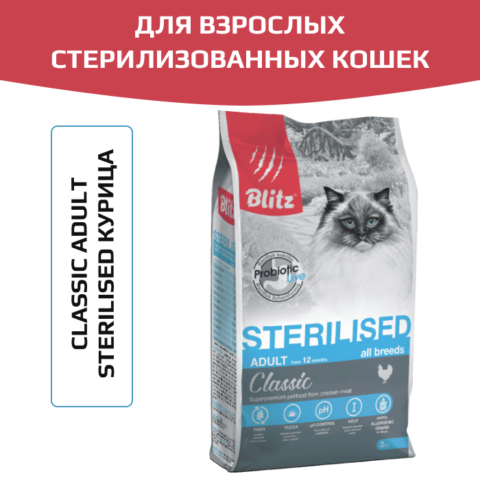 Blitz Classic Chicken Adult Sterilised Cat All Breeds корм сухой для стерилизованных кошек с курицей.