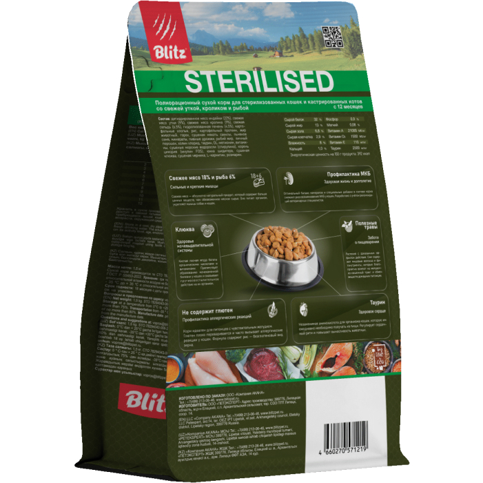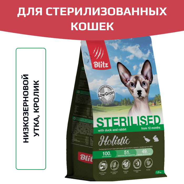 Blitz Holistic Sterilised Cat низкозерновой сухой корм для стерилизованных кошек, утка и кролик.