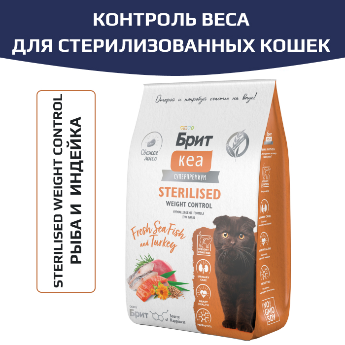 Полнорационный сухой корм суперпремиум-класса с морской рыбой и индейкой для стерилизованных кошек. Контроль веса. Стерилизованные кошки могут набирать вес из-за снижения активности. Это приводит к болезням сердца, печени и почек.