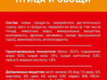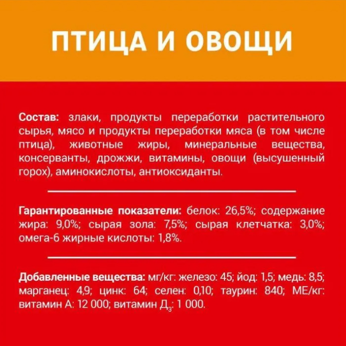 Белок: 26,0%; Жир: 8,0%; Сырая зола: 7,0%; Сырая клетчатка: 2,5%; Кальций: 1,0%; Фосфор: 1,0%; Омега 6 жирные кислоты: 1,5%. МЕ/кг: Вит. А.: 12500; Вит. D3: 1000; мг/кг: железо: 47; йод: 1,5; медь: 8,9; марганец: 5,1; цинк: 66; селен: 0,1.