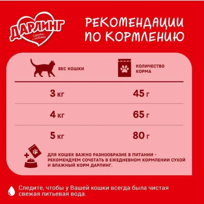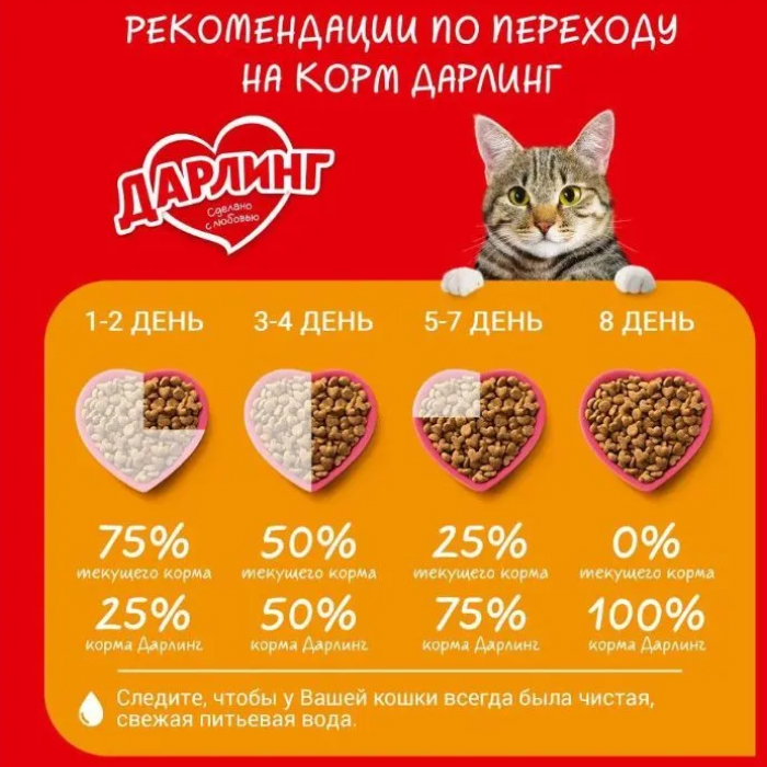 100% полнорационный сбалансированный корм для ежедневного питания вашей кошки. Корм Darling обеспечивает вашу кошку всем необходимым в ее повседневной жизни. Гарантия качества Purina®. Содержит все необходимые витамины и минеральные вещества. Корм для кошек Darling, содержащий Омега 6 жирные кислоты, помогает поддерживать шерсть вашего питомца здоровой, блестящей и приятной на ощупь.