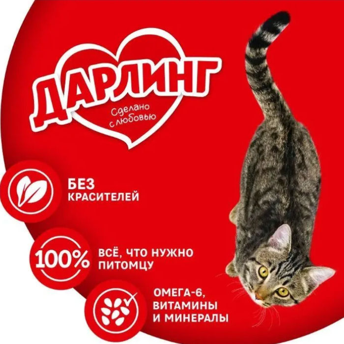 Сделано с любовью c витаминами и минеральными веществами с мясом по-домашнему и овощами Без добавления усилителей вкуса 100% полнорационный сбалансированный корм для ежедневного питания вашей кошки. Корм Darling обеспечивает вашу кошку всем необходимым в ее повседневной жизни. Гарантия качества Purina. Содержит все необходимые витамины и минеральные вещества. Корм для кошек Darling, содержащий Омега 6 жирные кислоты, помогает поддерживать шерсть вашего питомца здоровой, блестящей и приятной на ощупь.