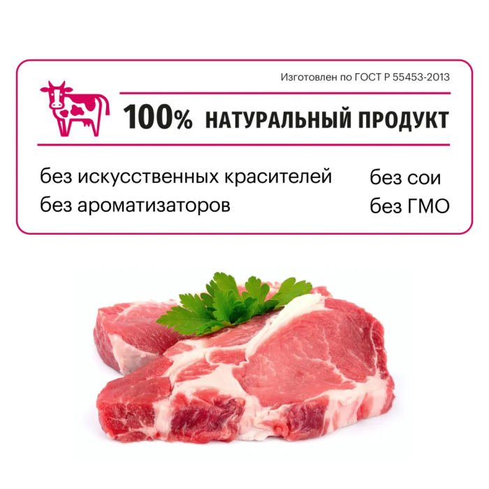 Не содержит субпродуктов, ароматизаторов, красителей и вкусовых добавок;