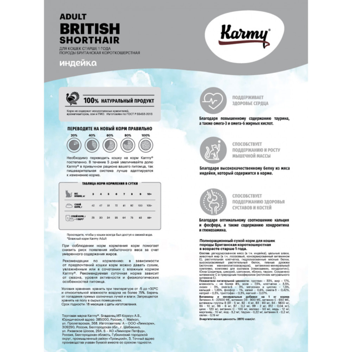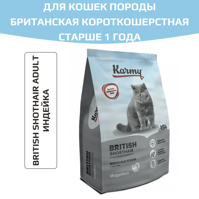 Karmy Breed Line British Adult Shorthair корм сухой для кошек породы британская короткошерстная в возрасте старше 1 года, индейка.