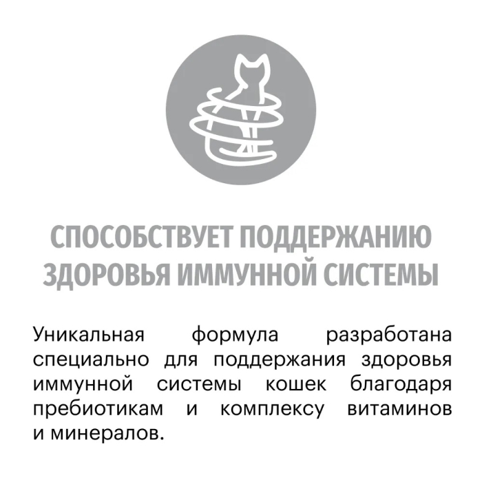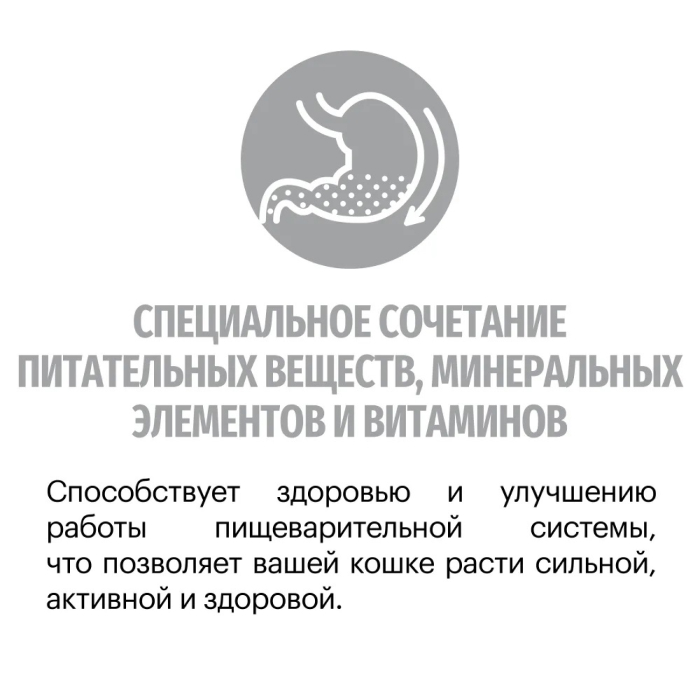 Способствует здоровью и улучшению работы пищеварительной системы, что позволяет вашей кошке расти сильной, активной и здоровой.