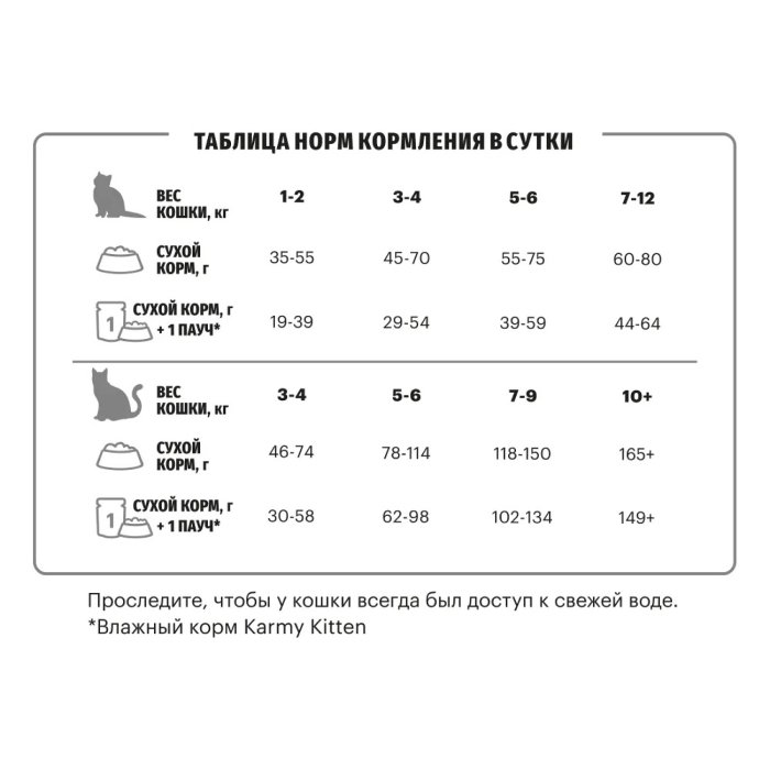 | Беременная кошка/кормящая кошка, кг | Кол-во корма, гр |