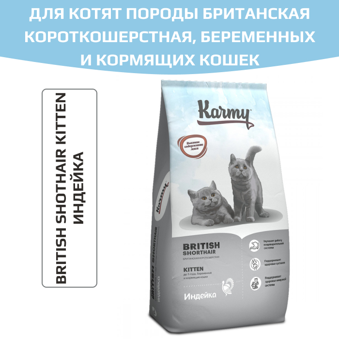 Karmy Breed Line British Kitten Shorthair корм сухой для котят породы британская короткошерстная в возрасте до 1 года, беременных и кормящих кошек, индейка.