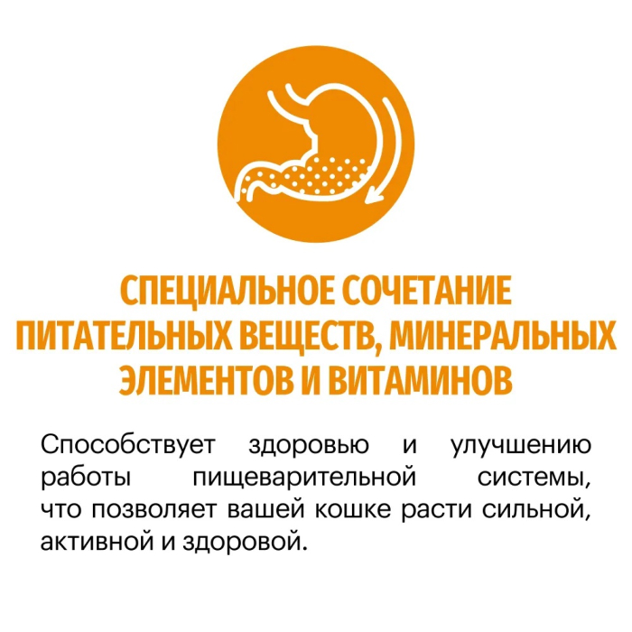 Способствует здоровью и улучшению работы пищеварительной системы, что позволяет вашей кошке расти сильной, активной и здоровой.