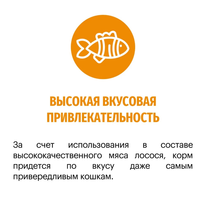 За счет использования в составе высококачественного мяса лосося, корм придется по вкусу даже самым привередливым кошкам.