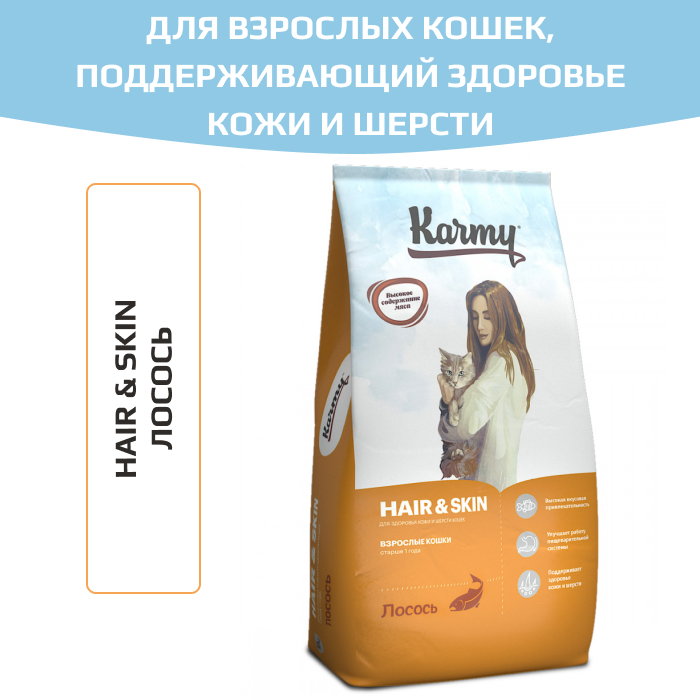 Karmy Special Line Hair and Skin корм сухой для взрослых кошек в возрасте старше 1 года, поддерживающий здоровье кожи и шерсти, лосось.