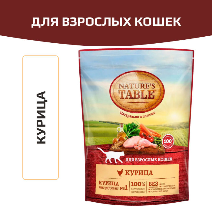 Рацион для взрослых кошек Nature`s Table Курица содержит на 100% натуральные ингредиенты самого высокого качества, получаемые от проверенных поставщиков: