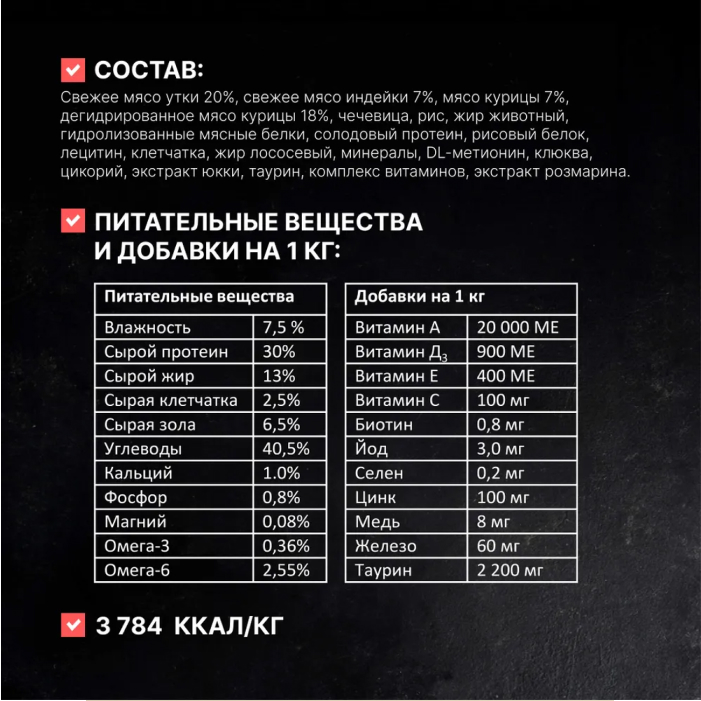 свежее мясо утки 20%, свежее мясо индейки 7%, мясо курицы 7%, дегидрированное мясо курицы 18%, чечевица, рис, жир животный, гидролизованные мясные белки, солодовый протеин, рисовый белок, лецитин, клетчатка, жир лососевый, минералы, DL-метионин, клюква, цикорий, экстракт юкки, таурин, комплекс витаминов, экстракт розмарина.