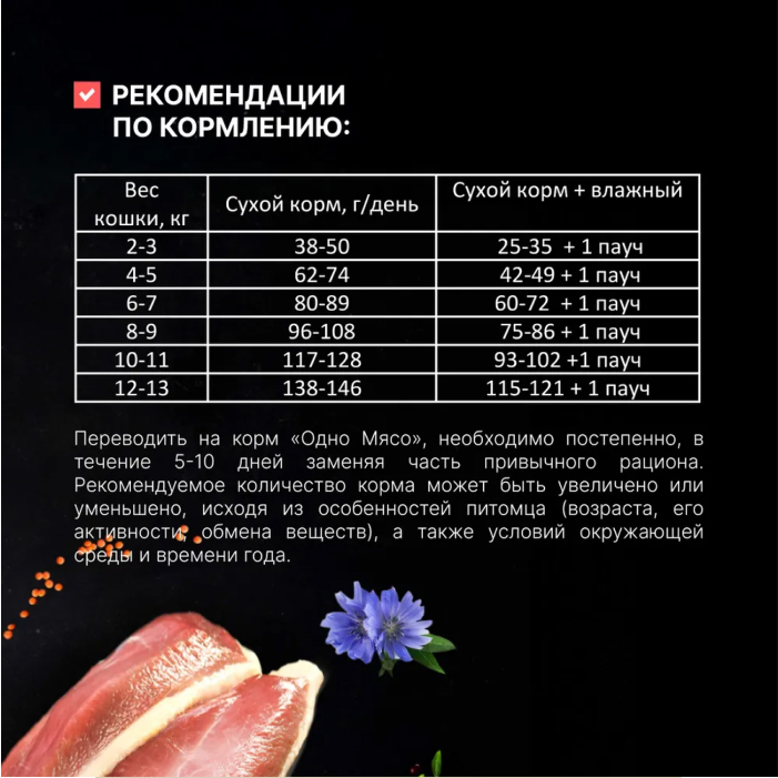 переводить на корм «Одно Мясо», необходимо постепенно, в течение 5-10 дней заменяя часть привычного рациона. Рекомендуемое количество корма может быть увеличено или уменьшено, исходя из особенностей питомца (возраста, его активности, обмена веществ), а также условий окружающей среды и времени года.