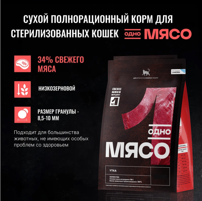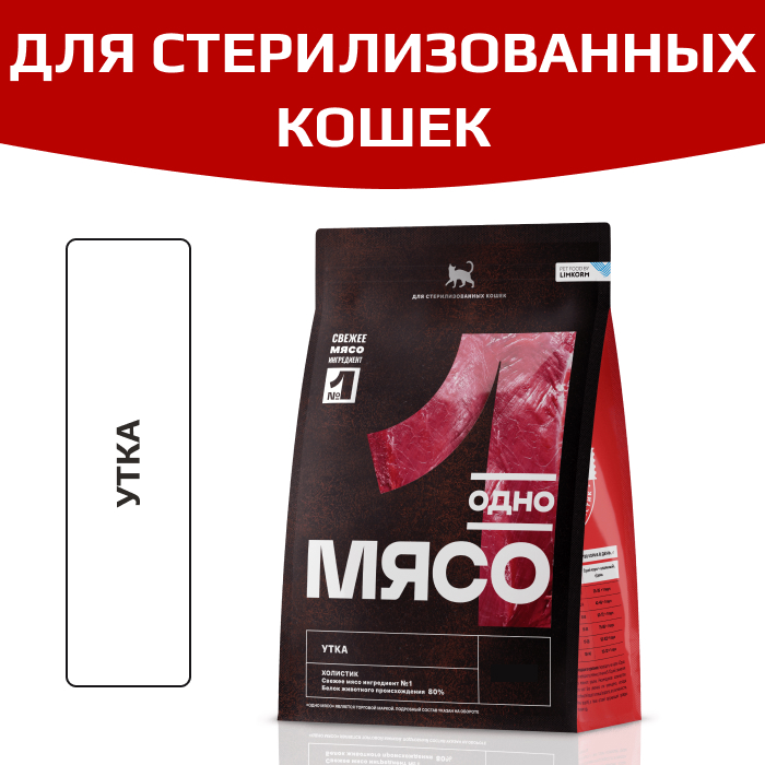 Одно Мясо корм сухой для стерилизованных кошек с мясом утки.
