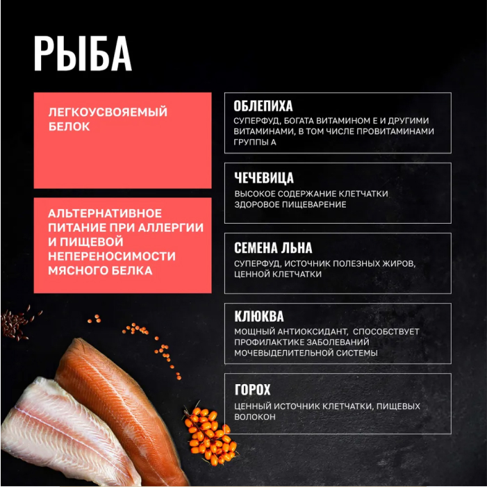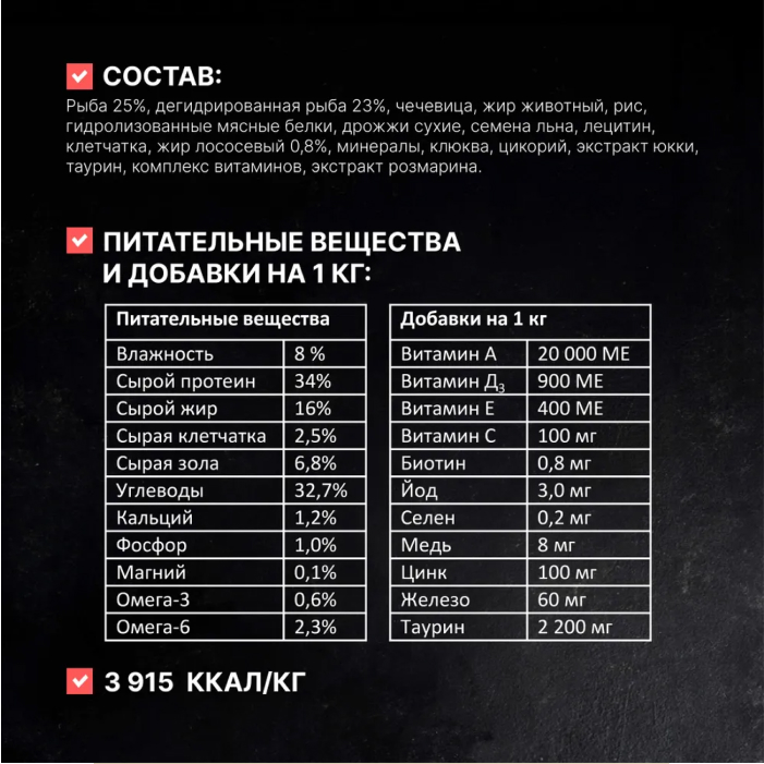 рыба 25%, дегидрированная рыба 23%, чечевица, жир животный, рис, гидролизованные мясные белки, дрожжи сухие, семена льна, лецитин, клетчатка, жир лососевый 0,8%, минералы, клюква, цикорий, экстракт юкки, таурин, комплекс витаминов, экстракт розмарина.